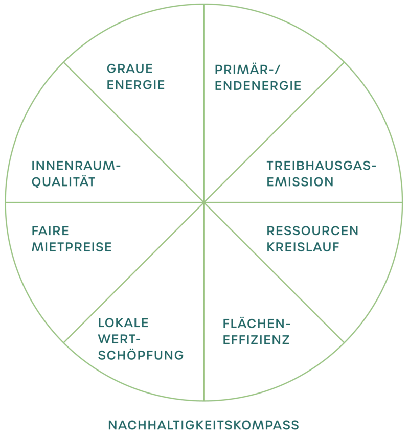 Nachhaltiges Bauen erfordert ein systematisches Vorgehen. Für GUTGRÜN steht dabei ganzheitliches Denken und Messbarkeit im Zentrum. Die entscheidende Weichenstellung bei einem Projekt geschieht ganz am Anfang mit der strategischen Planung. Damit diese gelingt, hat GUTGRÜN ein «Regiebuch» entwickelt. Es ist dies ein Optimierungs- und Kontrollwerkzeug rund ums Planen, Bauen und Betreiben. Herzstück des Regiebuchs ist die Zieldefinition, welche mit dem Nachhaltigkeitskompass gekoppelt mit einer dynamischen Ökobilanz- und Marktwertermittlung übersichtlich dargestellt wird. Für Investoren und Partner wird so die Wechselwirkung zwischen den ökologischen, sozialen und ökonomischen Faktoren sichtbar.